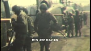 B-roll of American soldiers in battle in Vietnam. MS of men standing next to choppers. CU of…