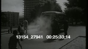 Two police officers jump out of their car and run towards a circle of commotion. They run…