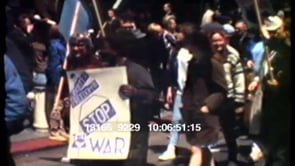 MS of people marching down street with signs for peace march. People watching on the side walks.…