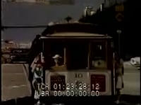 Cable car coming up, then down, a hill in San Francisco with people getting off and on. Alcatraz…