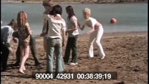 WS of a group of women playing football on the beach., The ball is hiked and a blonde woman runs…