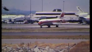 A Boeing 727 taxis at SFO. Mountains are visible in the distance.