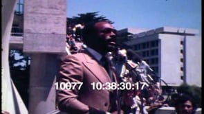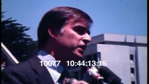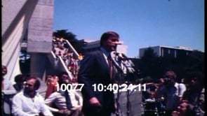 More of Governor Jerry Brown making a speech about California propositions and various government issues in front of a large outside crowd at San Francisco State University. He also takes a few questions. Property tax seems to be a big issue.