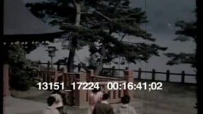 Wide shot of Lake Chuzenji with waterfalls, Nikko National Park; Large cruise ship disembarking in harbor; traditionally dressed Japanese woman waves **CAREFUL: INCLUDES “A WORLD FAMILY FORUM FILM - THE END - AN ALFRED T. PALMER PRODUCTION - SAN FRANCISCO”