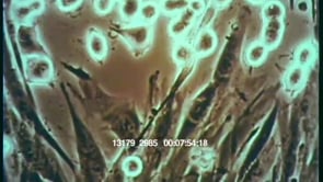 Informational film about cancer cells. Clip opens with cells moving. Cancer cells are being shown. Narrator discusses cancer genes and how when a cell becomes cancerous it fails to divide properly. Cancer cells are moving. Narrator discusses metastasis. Shot of normal kidney cells to shot of cancerous kidney cells. White blood cells, CU of cell dividing and CU of cancer cell next to normal cells. Narrator discusses the structure of cells and metastasis. Cancer cells are being destroyed by healthy cells.