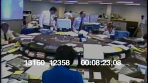 Stock traders in an office working on computers from the 1980s. A man at a phone board sits at his desk with a few phones on hold. CU of computer screens.