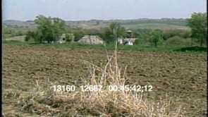Shows midwestern farms surrounded by trees. Moving shots show crop fields…