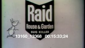 Commercial for Raid House & Garden Bug Killer. Cartoon bugs sitting in a large room listening to a bug giving a speech on stage. Bug is smoking a cigar while giving a campaign speech. He is handed a piece of paper, he read it and yells “Raid’s here!” and runs. All of the bugs run out of the room. An animated can of Raid sprays itself and kills a bug. Cartoon mosquitoes, roaches, ants are killed by the spray. A live action hand sprays Raid on plants in a garden.