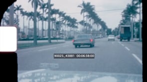 Shot of a towering building from below. Pan across buildings in Miami, Florida from raised position. Shopping on Lincoln Row. Palm trees lining road. Palm trees on sandy beach, girls in bikinis frolic by. They run into the water splashing. Boat with man on water skis rides by. Front entrance of Miami Skyways Motel. Miami at night. Kenilworth sign, Deauville sign, Monte Carlo sign. Carillon sign advertising New French Revue. Inside nightclub, girls with fabulous costumes dance on stage. They flip up their dresses and do saucy dance moves. They all do the splits in a line. Daytime at a pool a women’s legs walk gingerly around edge of pool. Woman dives in off diving board. Girl emerges from water near pool side and smiles toward camera. Man in sunglasses waves at girls in bikinis as they lie down with their feet in the air.