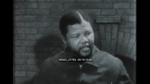 Several shots of black farmers working; MS of a black boy watching his parents working. Scene cuts to a white family’s house and their servants; a young black man cleaning the floor. A black woman reading a book to white children. Shots from treason trial; busy streets, a still from the trial; CU of Nelson Mandela; protesters waiting outside.