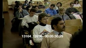 Begins with MCU of two female students taking notes. Cuts to CU of female student’s hand writing notes. Cuts to MS of teacher lecturing to students, he approaches chalkboard and writes ‘UNDP’ then walks down aisle, students at desks are visible. Cuts to MLS of students in FG and teacher near chalkboard in BG lecturing. Cuts to CU of female student listening to lecture.