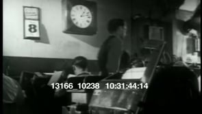 Film about productive working to help the war effort. CU on man in lifeboat with one deceased and other dying. CU on man's watch intercut with scenes of man at ball game and images of clocks. Different scenes of clocks in different locations to represent the importance of working on time to help the war effort all around the world for the American soldiers and at home. Images of factories and guns working intercut with scenes of clocks and time keeping devices. People hurrying about in factories and military bases. Images of men and women working in different industries to build war machines and other tools and items to help the troops. Clip ends with a CU of clock hands with images of troops marching and planes flying.