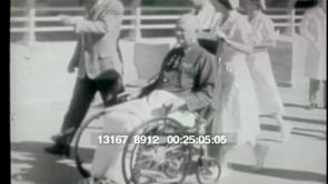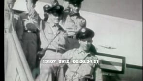 Newsreel clips: Wide shot of bridge in New York City over the East River. Close up of Clau(?) Samuel A. Rumpenin(?), a Finnish man wanting to draw attention to his deportation appeal, climbs and walks along the bridge girders. Photographers and crowd watch from bottom of bridge, until a bridge worker traps him. A group of bridge workers tie him up and lower him to the ground, where police lead him to back of a police van. Pope Pius XII stands on balcony in front of cheering crowd after recoverig from illness. President Eisenhower stands in front of American flag and blind covered window. Eisenhower rides in a car, then walks along what looks to be a marching band during his vacation in Denver. Other vacation clips: golfing, in river catching mountain trout, opening Christmas presents with family. Shot of Fitzsimons Army Hospital sign, then shot of the hospital itself (Eisenhower was rushed there when he had a heart attack.) Reporters in Summer Whitehouse (Lowry Air Force Base) sit at desks typing, reading or talking, and one man rushes down aisle in “whirlwind of activity.”