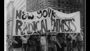 This newsreel contains footage of music festivals and women protesting for equal rights. Begins with a large crowd surrounding a stage. A street lined with cars, passengers hang out their windows, cuts to a shirtless man smiling and waving out the window. A crowd at a music festival. A man dancing. Cuts to various shots of the stage as a man plays guitar, another sings. A man’s vest with ‘Acid’ written on it. Three shirtless men sharing a joint. A woman in religious garb changing words of religious mantras to reflect women. Cuts to the Statue of Liberty, a sign at her feet reads: ‘Women on the World Unite!’ Cuts to various shots of women marching and holding signs about women uniting, equal rights, abortion, and fashion. Cuts to various shots of women’s legs as they walk. End credits contain rocket launch footage.