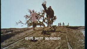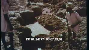 Clips of the Rajputs, cultivators of the Great Indian Desert. A man in white clothes and a turban approaches a cart that has dirt clumps piled on it. He puts a few of the dirt clumps in a shallow bowl, carries the bowl on his head to a trench and dumps the dirt clumps into the trench. (The trench may be part of their irrigation system. Perhaps the fresh dirt adds nutrients to the water.) Shot of man standing in shallow trench of water near where well water first gets dumped into irrigation system. He drops a few clumps of dirt into the water and mixes it in with his feet. Shot of a trench with gently flowing water. Further down steam, the trench feeds water to a network of much smaller channels that spread through a field of grass and trees. Women in a soggy part of the field seem to be doing maintenance or repair work on some of the channels.