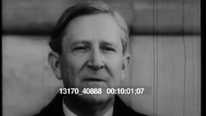 1932 presidential election. A long line of people (the line goes past several buildings and disappears around a corner) leads to a building door. “Board of Elections Meets Here” signs hang on the building’s windows—it is a designated polling station. Video cuts to shot of photographers snapping pictures of Franklin D. Roosevelt checking in with voting clerks. He stands with his arm linked in his son’s arm for balance. Then FDR stands in a voting booth with the curtain pushed aside, still grasping his son’s arm. Next shot is of Herbert Clark Hoover handing his paper voting ballot to a man who drops it in a voting box. Video cuts to shot of a young man tapping keys on a typewriter. Next to the young man is an auto-typist or memory typewriter. (Typewriters that read roles of perforated paper. The hole patterns corresponded to text to be typed.) Several different shots follow: a radio announcer in front of microphone, a man talking on phone, a large board where men are making some sort of vote tally next to state names, someone at a typewriter. FDR announces winning by a landslide. Crowds cheer outside in the dark at Times Square (lit up, blinking signs are visible in background and a spotlight moves over crowd).