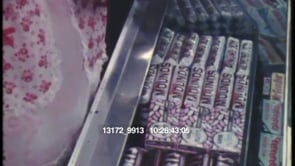 Woman working at theater concession stand. Medium shot, woman wipes hands on uniform, steps to her left and eats popcorn; shirt and skirt removed, woman eats and pours popcorn on herself, eats candy, removes bra, opens Butterfinger and dispenses butter on it, then eats; medium CU, she has spread butter over her upper body, dispenses butter onto handfuls of popcorn and eats