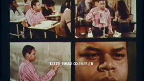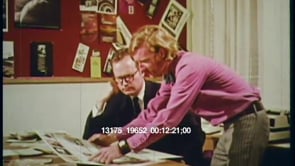 Footage from a program explaining different jobs in the radio and television industry in the 1960s or 1970s. Graphics and words appear down the screen. “Engineering, Sales, Business, Programming.” Zoom out shot from a small television screen to a large contol panel with two large film reels. A man adjusts a dial on it. MS of a man behind glass in a room surrounded by tapes. He raises his hand to the person on the other side and points to him when he’s ready. CU of men in a dark control room full of television screens. Montage of people recording sound. MS of a man adjusting a large studio light. Montage of people “behind the scenes” of a television production. Pan shot from African American woman with large afro performing on stage to cameramen filming her with a live studio audience visible behind them. CU of a man adjusting knobs on a transmitter. CU of newspaper clippings, a small headline is visible reading “Employment.” The word “Sales” appears on screen. A man in a large gray coat, hat and briefcase arrives at a receptionists desk in an office. WS of a meeting in a conference room. A tall blonde man stands at the front of the room giving a presentation to two men and a woman. CU of the poster he is presenting reads “Here’s How” and logos for CBS and NBC are printed below it. MS of one of the men asking a question about the presentation. The presenter flips the page to a CU of a calendar reading “Mrs. Paul’s 1972: The Best Meals, The Best Sales Yet!” below it is an advertising calendar that shows a column with the subject heads: CBS , NBC, Reader’s Digest, Good Housekeeping, Woman’s Day, Sunset, and Local TV. Two African American men in suits discuss paperwork in an office with a large window overlooking the city.