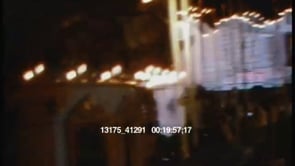 Home movie from Disneyland in 1968. WS of father and daughter waiting in line for a ride. Tilt shot up two large totem poles, a large Asian family passes by. MS of two men dressed in Native American attire stand in front of a line of people next to a river. A large, rustic sail boat filled with passengers passes by. MS of large three-level steamboat painted all white passes by filled with passengers. CU of stern wheel. MS of boat passing, reveals the boat name “Mark Twain.”