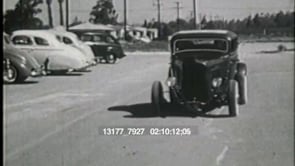 Film about hot rods. Two boys (teens) work on a car. Boy looks at Hot Rod Magazine. Articles include "Blown Buick V-8, Tune Up Tips, Homespun Terror, High School Hot Rod Show." Woman in a swim suit poses on top of a car. Other articles in the magazine are "A V-8 in your Model A" and "Build Yourself a Fordillac." Cars drive down the road at night. Teen boys race cars down the street. Policeman on motorcycle goes after them. Teen boy is driving fast. Shot of his foot pressing down on the accelerator. Police car chases him.