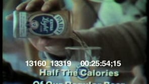 “Why do you drink light beer?”; Men in a box at a sporting event pour…