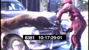 Hunters in snow. Wounded deer in snow. Hunters affix deer to car hood.
