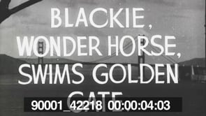 Wilfred Roberts and Shortie Roberts lead Blackie the horse along the beach near the Golden Gate Bridge and enter the water. From a rowboat, Wilfred baits Blackie with sugar, who swims after it pulling Shortie, who hangs onto a rope tied to Blackie's tail.