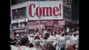 LS of LGBTQ protestors in the West Village in NYC, summer of 1977. CU on signs reading, "We Demand Gay Rights," "Human Rights for Gays and Straights," and "Gays and Straights Can Live Together." CU on gay couple kissing, making out, on a bench and showing embarrassment.