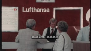 Two men in suits get their plane tickets at an American Airlines ticket-dispensing machine called "transAAction." Once they have their tickets, they quickly walk off, perhaps to their boarding gate. Wide shot of an American Airlines plane lifting off.