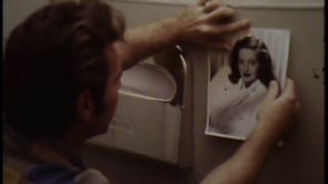 A man in a bathroom stall hangs a poster of a man on a motorcycle onto…