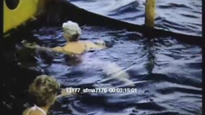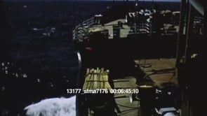 WS of a barge traveling through the rippling ocean. Two tourist women…