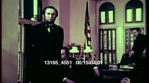 Begins with MCU of Abraham Lincoln at a desk, a man sits in FG. Cuts to…