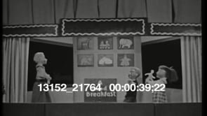 Boy and girl puppet at breakfast table, mother puppet answers door.…