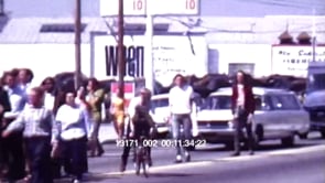 People on motorcycles. Crowd on the street near “Entering Oakland” sign…