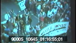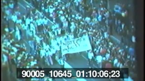 Bird's eye view people march, ride floats, hold signs and balloons…