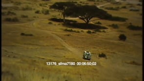 Shot of car driving among grassy field. Large Acacia trees in the…