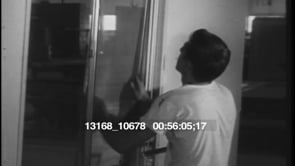 Indiana. Four factory workers in overalls hammer in window frames to…