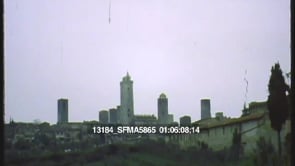 Title card reads “San Gemignano”. View of the walled city and its…