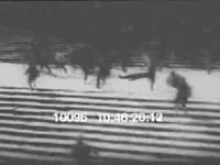 Soviet soldiers march in unison carrying long rifles. Stalin looks down…