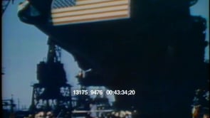News film showing Kennedy family at the launch of an aircraft carrier;…