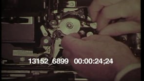 White bearded man in 1970s dress uses electronic pedal to create music…