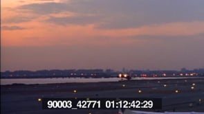 TWA airplane taking off into the dusk sky.