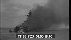 Shots of military ships and aircraft on fire with smoke billowing…