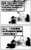 Felix tries to solve a crossword puzzle for his owner. His only clue is a word found in Russia. He steps outside in house and is kicked in the ass by a donkey all the way to Russia. In Russia he’s accused of being a spy. He’s then chased by a Russian and finds documented plans for a Russian revolt. Russians throw bombs at him, his tail falls off and he is then catapulted home by the force of an exploding bomb. Phew!
