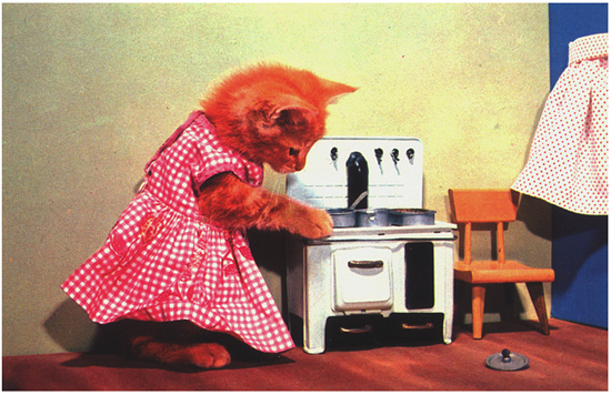 Mother Cat and her Baby Skunks (B+W, 1958)