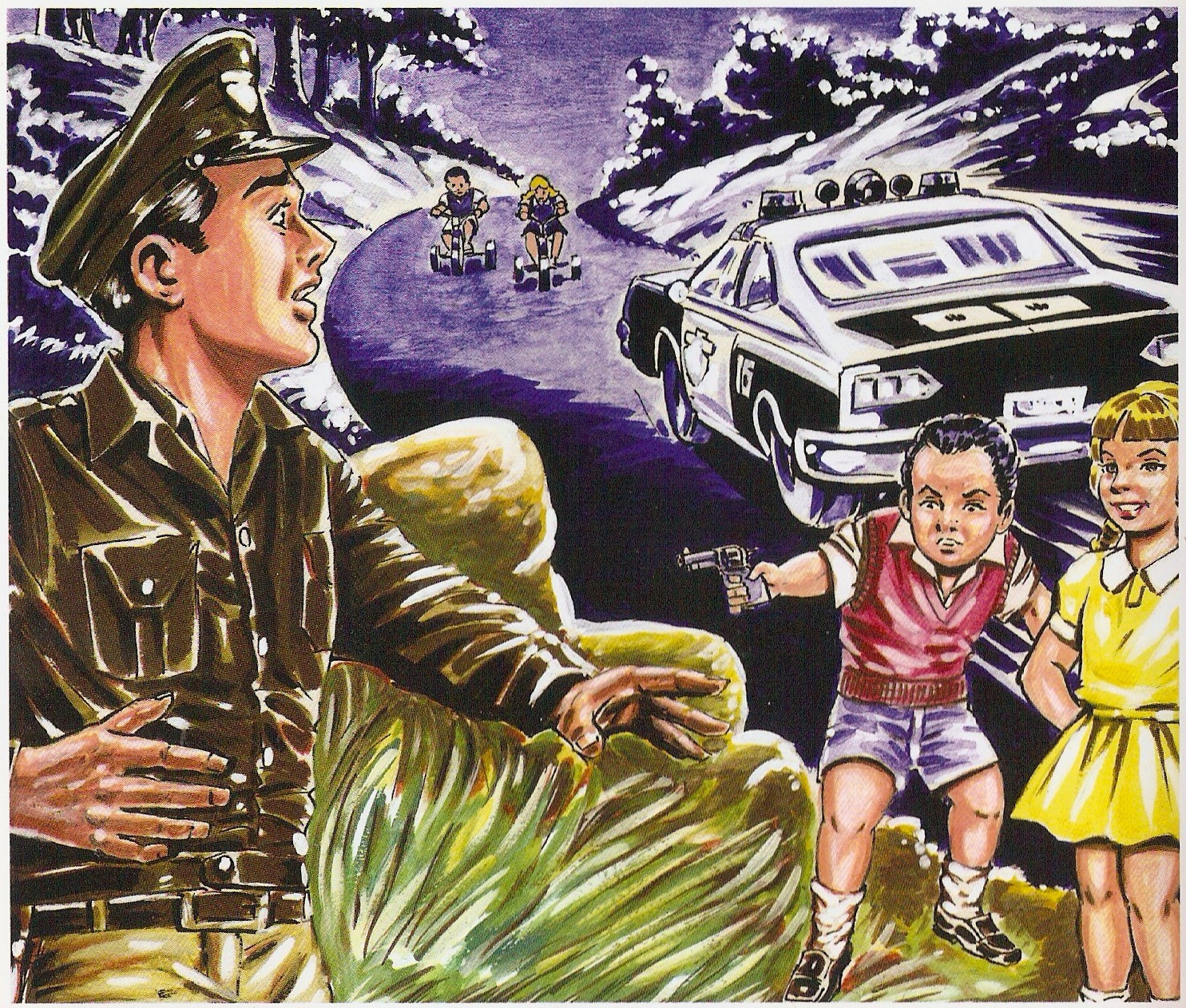 A detailed procedural reenactment of a murder arrest. Reminiscent of The Wire? Well, no, not really. But, in the less-than-brilliant criminal character you may see surface echoes of the graceless perpetrators of In Cold Blood. The action is presented from the point of view of the cops, whose narration of the event is done through mock radio transmission, with interior and exterior shots of the moving patrol car on its way to a fateful meeting with the suspect. During the reenactment of the actual arrest are interspersed stills of the suspect’s detainment. The half-empty bottle of Jim Beam proves a crucial in this cautionary tale.