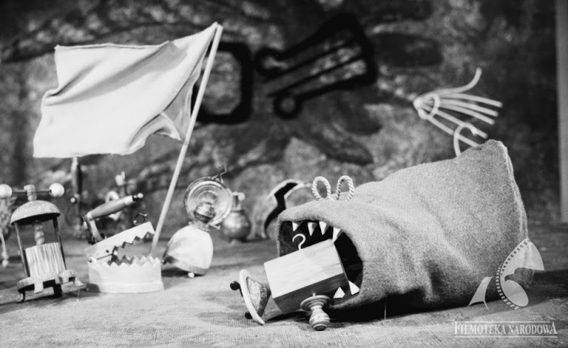 Mysterious and creepy stop-motion film from Poland- a burlap sack proceeds to consume everything in sight, until all the objects- scissors, sewing machines, etc. revolt, organize and subdue it. Directed by Tadeusz Wilcosz.