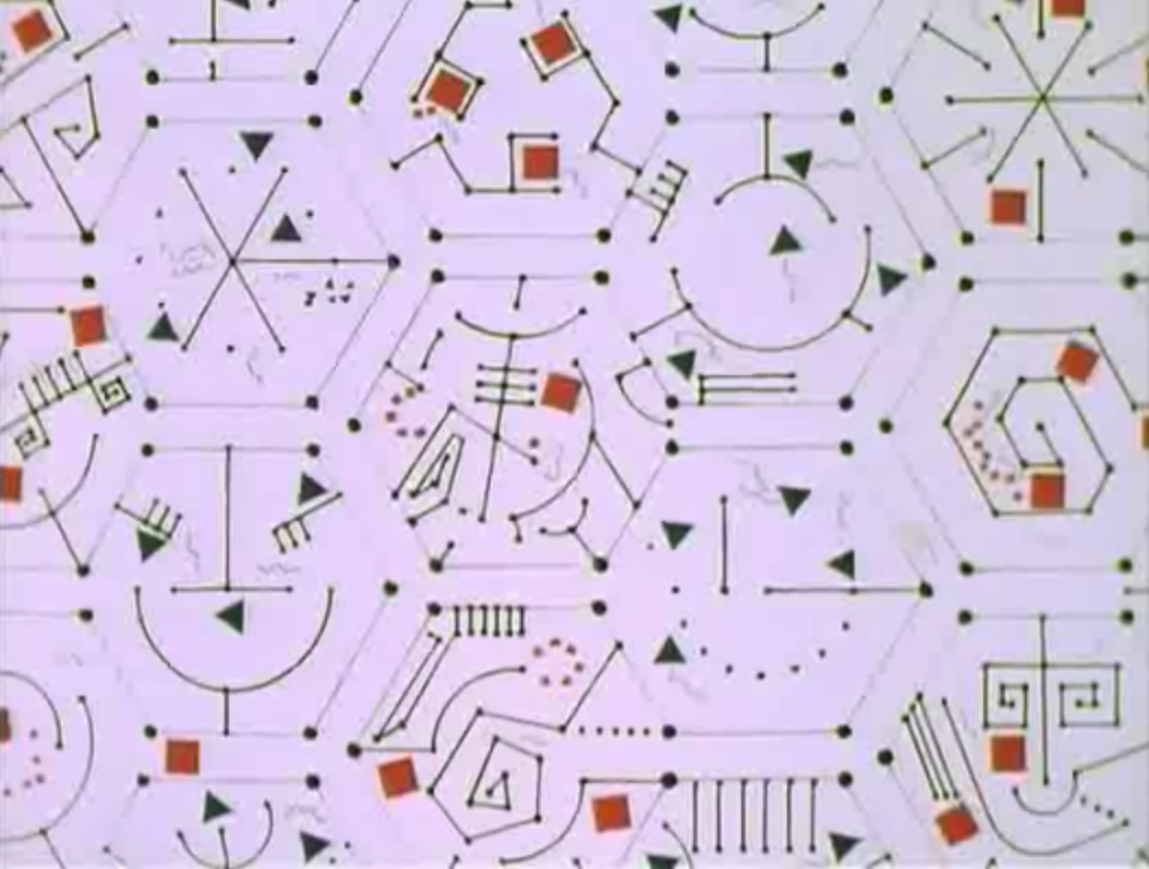 The images were all created with handmade cels, and the rotation of more than one of these cels creates some of the movements. John Whitney Sr. had built a pioneer computerized animation set-up—the prototype for the motion-control systems that later made possible such special effects as the "Star Gate" sequence of 2001. James used that set-up to shoot some of his handmade artwork, since it could ensure accuracy of placement and incremental movement.