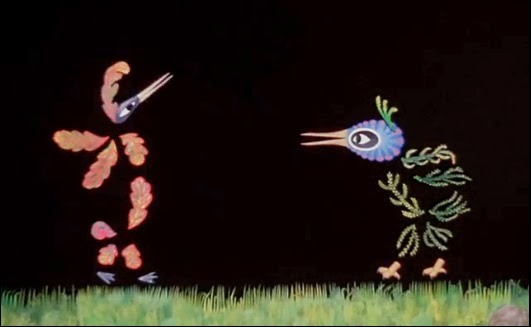 A charming cut out animation from Norman McLaren's frequent collaborator Evelyn Lambart. Two birds try to show each other up by trading their feathers for foliage and both end up paying the consequences when the wind ruffles their leaves.