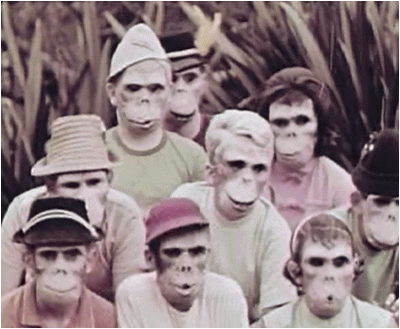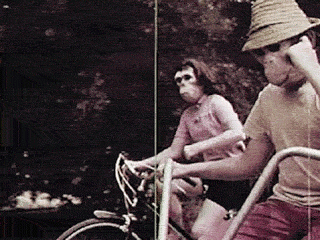 Bizarre/legendary bike safety film- 10 young cyclists acting like monkeys (wearing masks and tails!) head to a city park for a picnic. 9 out of 10 makes a bonehead mistake and suffers a major accident- all but one, who reaches the park and... Here’s how a few of the characters meet their demise:
